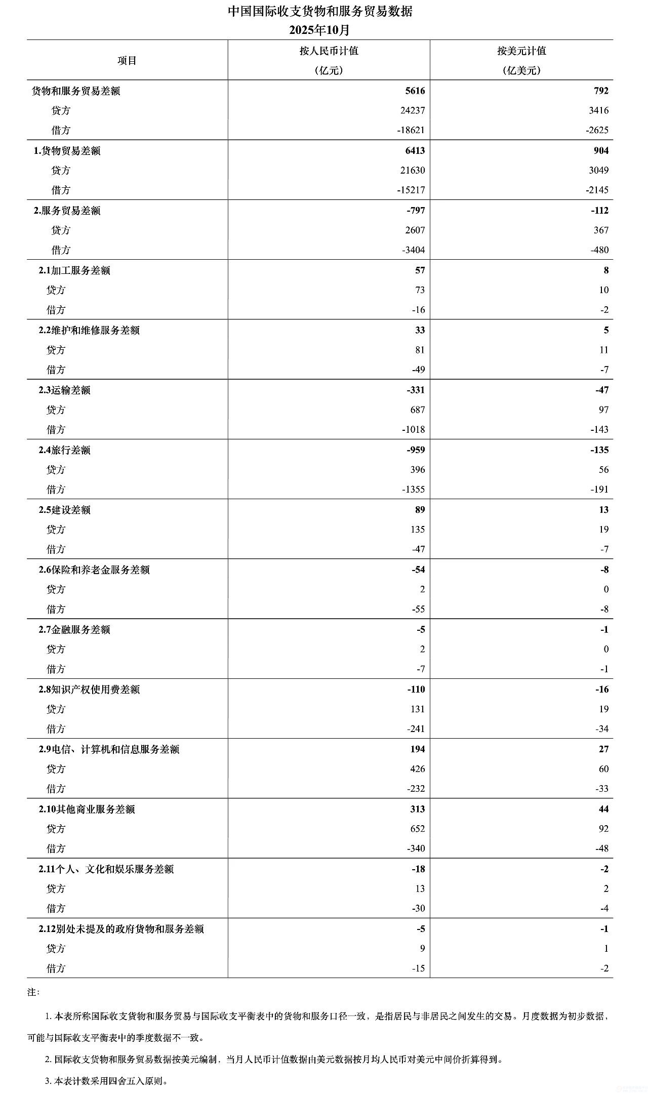 按美元计值,2025年10月,我国国际收支货物和服务贸易出口3416亿美元,进口2625亿美元,顺差792亿美元。(完)